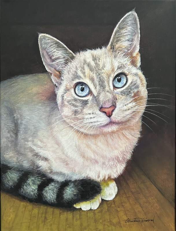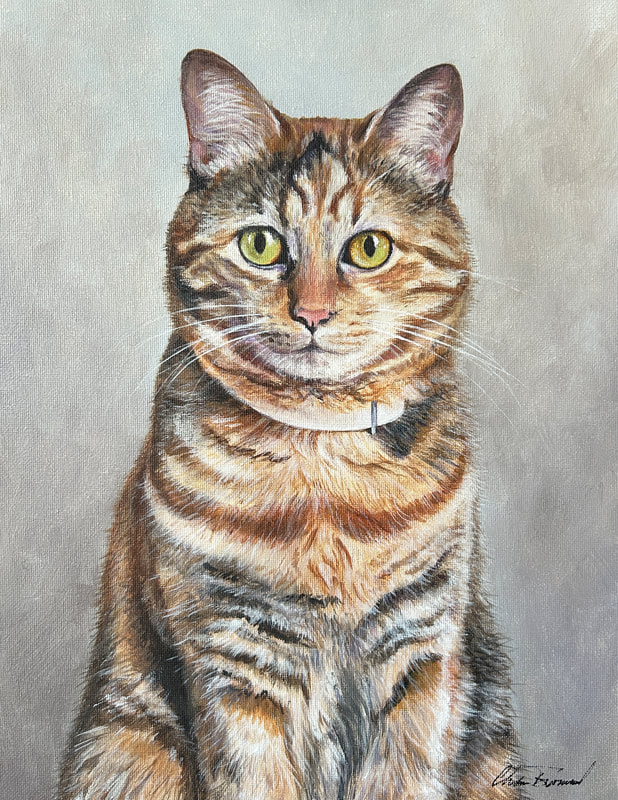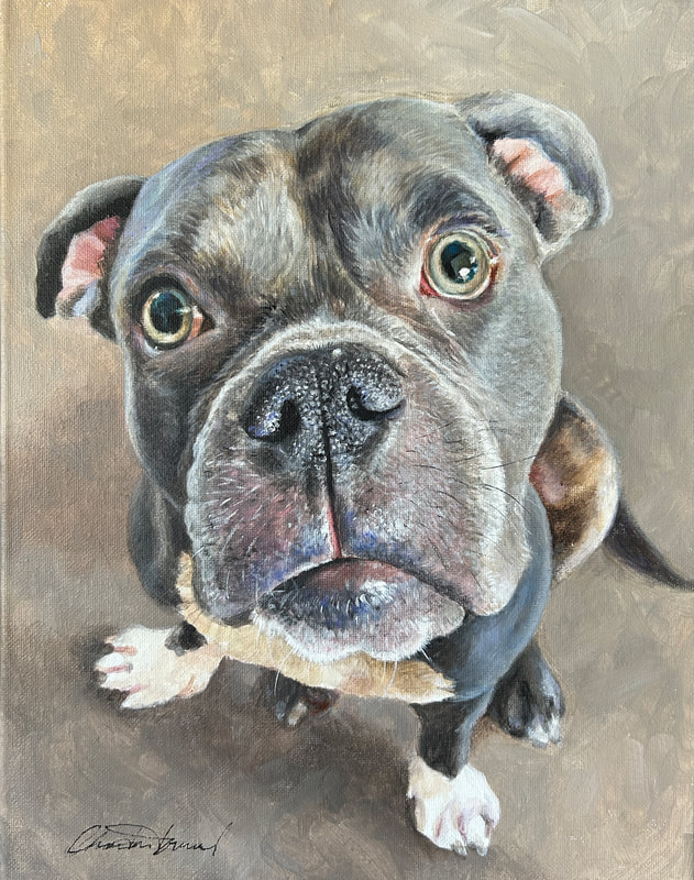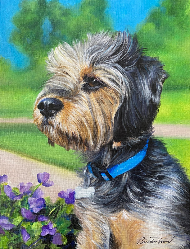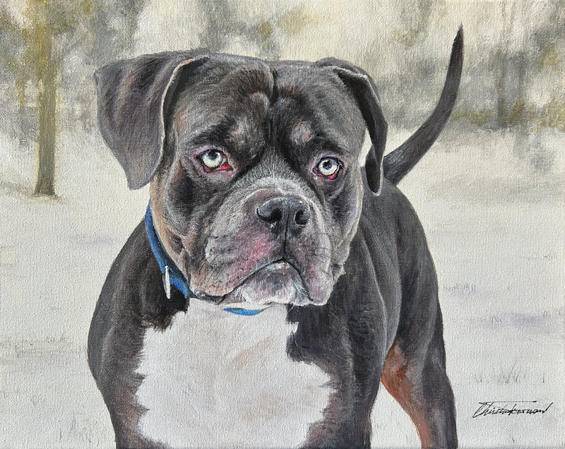 Good quality photographs for a pet portrait are key. The more photos you can provide, the better the portrait will be. One main clear and in-focus photo will be used for the painting, but multiple shots are helpful to capture detail. Ideally, take your photos outside in natural daylight from multiple angles. If you are looking to put two or more pets together in the same painting, it is not necessary to take photos of them together, however, it is helpful to have a few pictures of them together to reference their size differences. I often combine individual photos to create one scene. Send photos in their original size, please do not resize. Photos and instructions can be emailed to info@paintingsbychristine.com